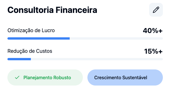 Maximize o Valor do seu Negócio. Nossa Consultoria Financeira Estratégica integra-se perfeitamente às soluções de Marketing, CRM Inteligente e Atendimento Automatizado, orquestrando o planejamento para o crescimento exponencial e a rentabilidade sustentável em todas as frentes da sua empresa